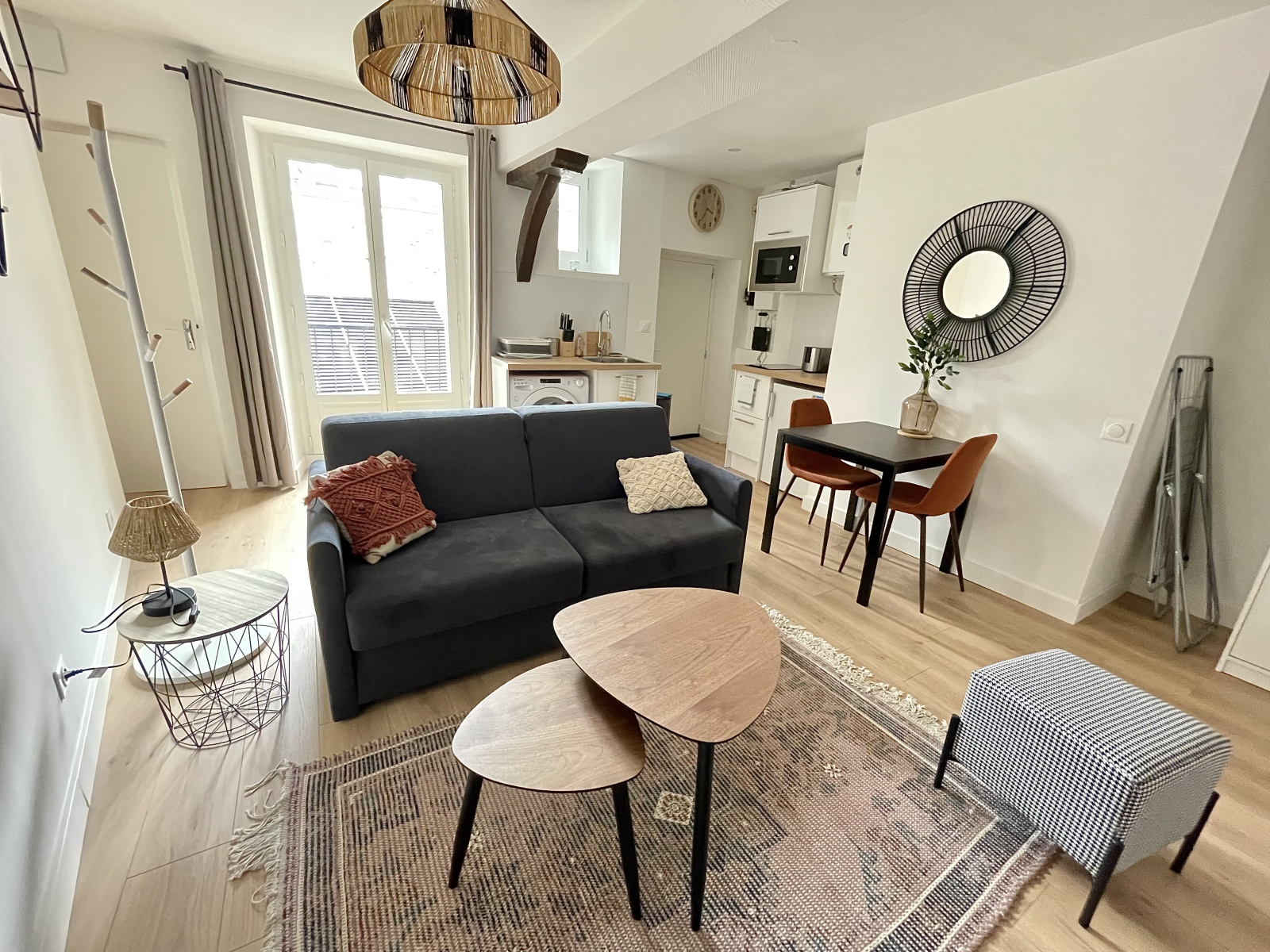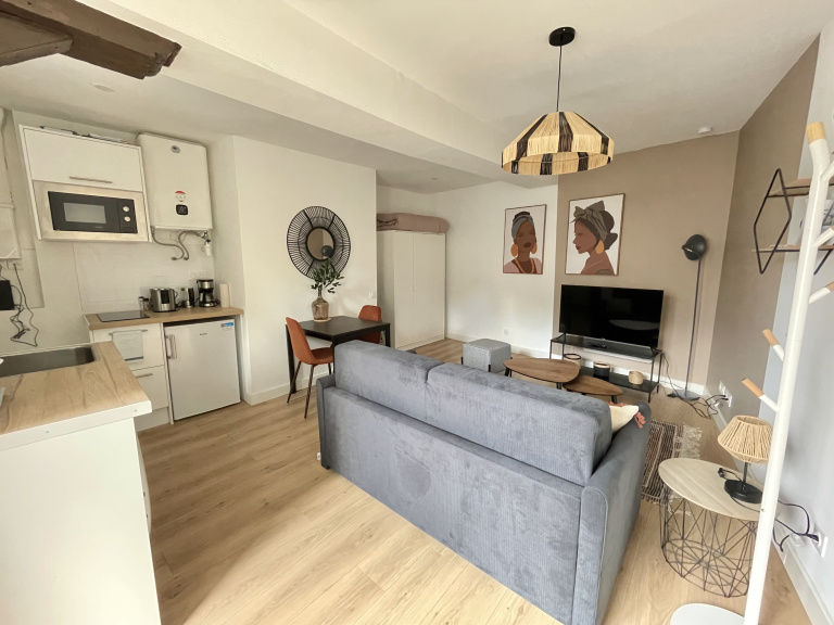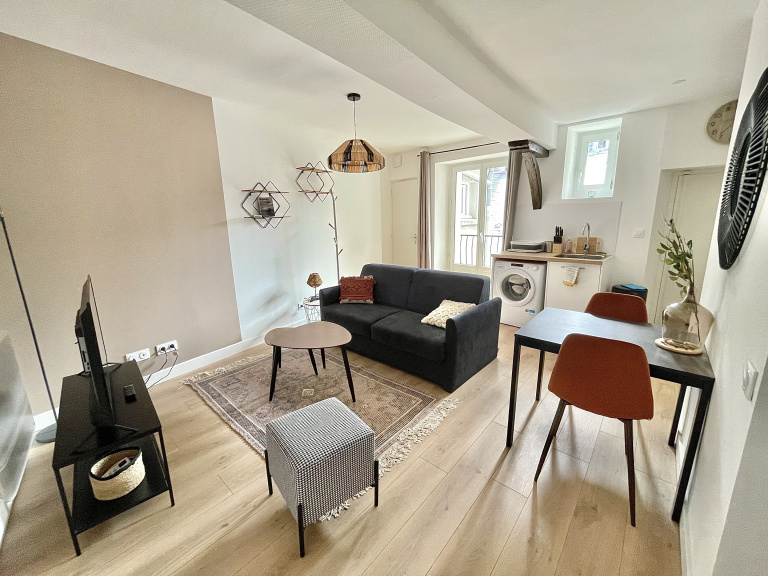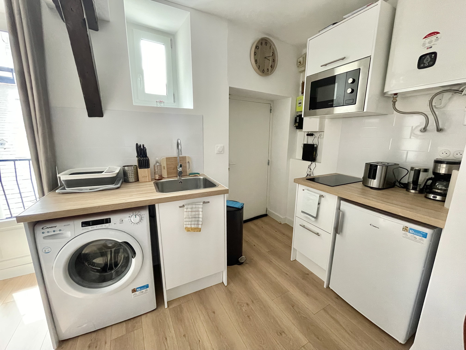 QUARTIER BOUFFAY, rue de la bâclerie, idéalement situé au 2ème étage d' un petit immeuble ancien, studio côté cour de 22.34 m² entièrement rénové avec beaucoup de goût et très bien équipé comprenant une pièce principale exposée sud-ouest avec coin cuisine aménagé et équipée (meubles hauts et bas, plaque de cuisson, réfrigérateur, micro-onde et machine à laver) et salle d'eau avec WC et sèche-serviettes.