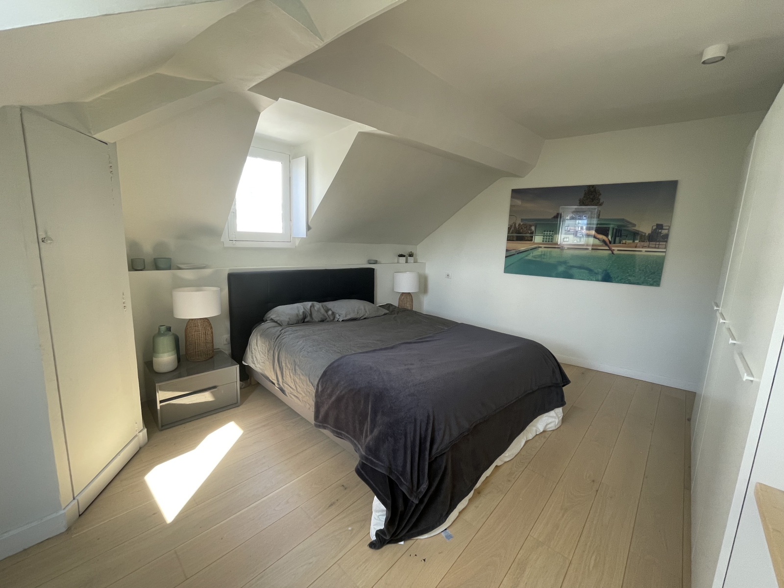 Au quatrième et dernier étage d'un immeuble ancien, charmant appartement type 2 de 48.87 m² entièrement rénové en 2020 avec beaucoup de goût et très bien équipé comprenant une grande pièce de vie avec salon/salle à manger de 22m² et cuisine avec verrière aménagée et équipée (hotte, four, plaque, lave-vaisselle, lave-linge), une belle chambre de 13.27 avec dressing et coin bureau et salle d’eau avec douche, WC et sèches serviettes.