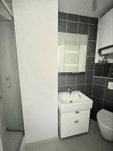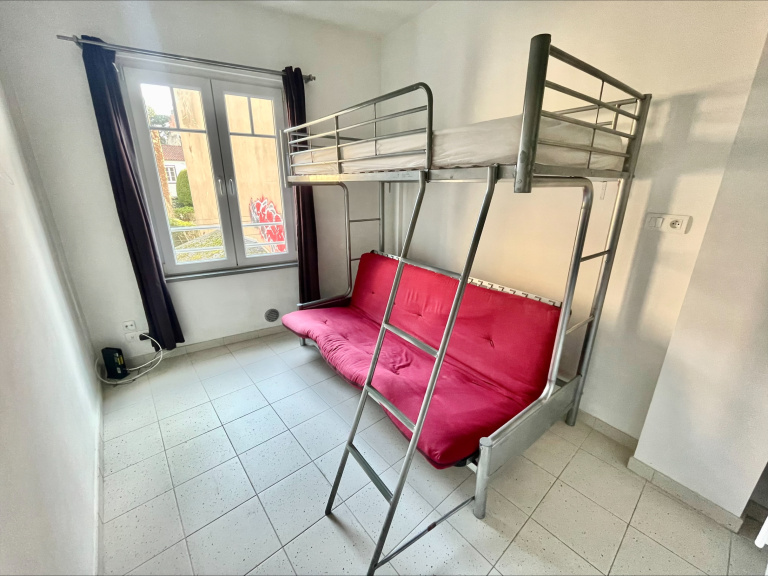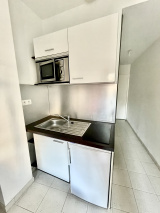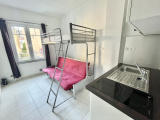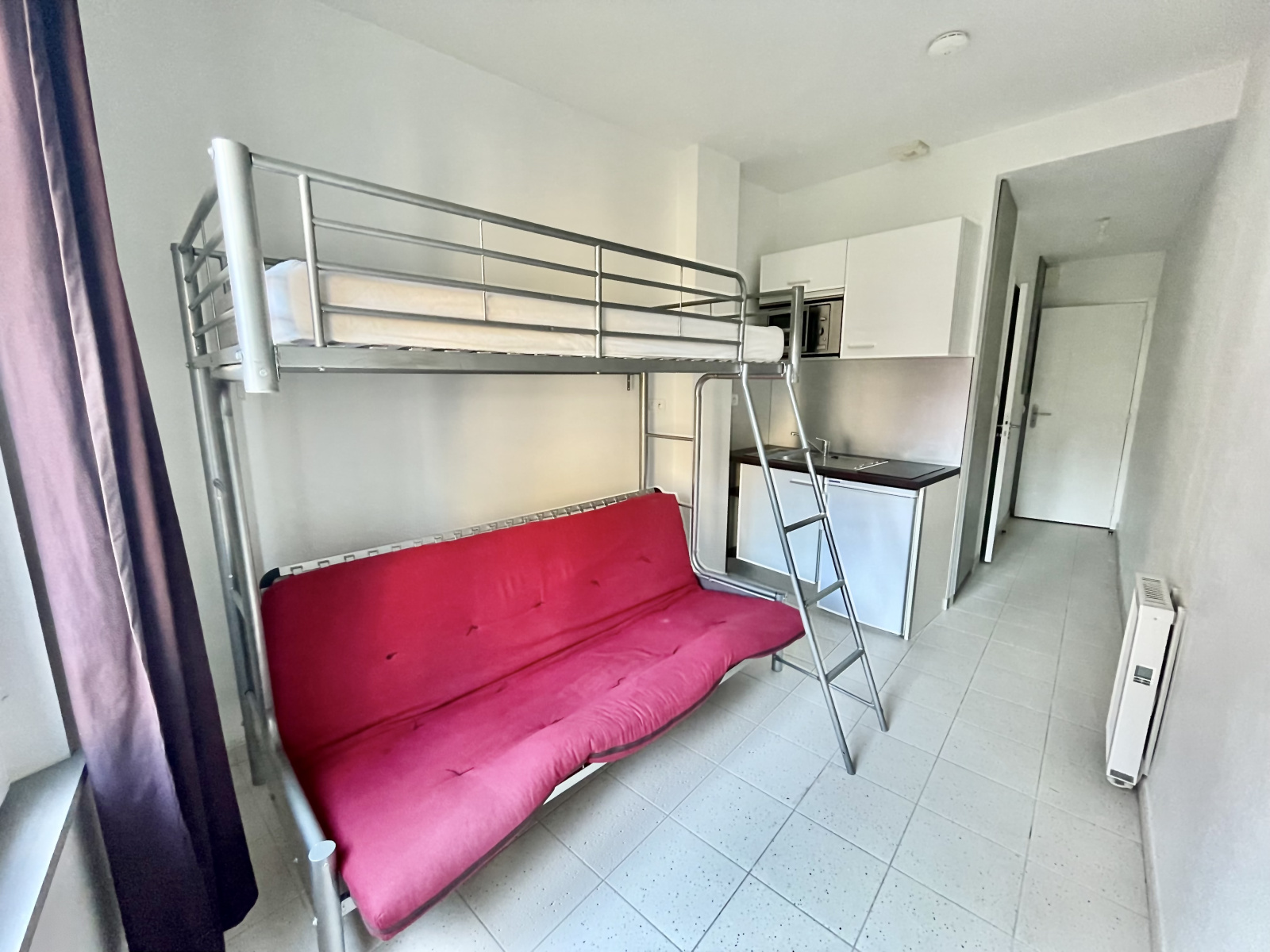 Au deuxième étage d'un immeuble ancien, studio de 13.80m² comprenant une pièce de vie exposée Sud avec lit en mezzanine et cuisine ouverte et équipée (placards, frigo + freezer, plaque à induction, four à micro-ondes) et une salle d'eau avec WC et sèche-serviettes.
