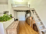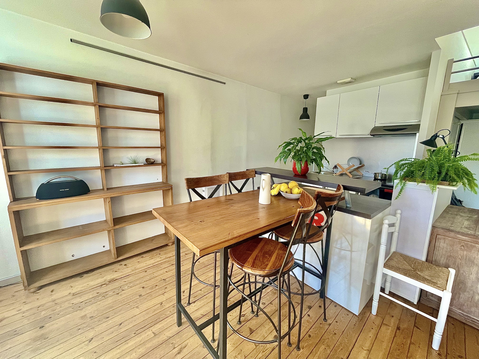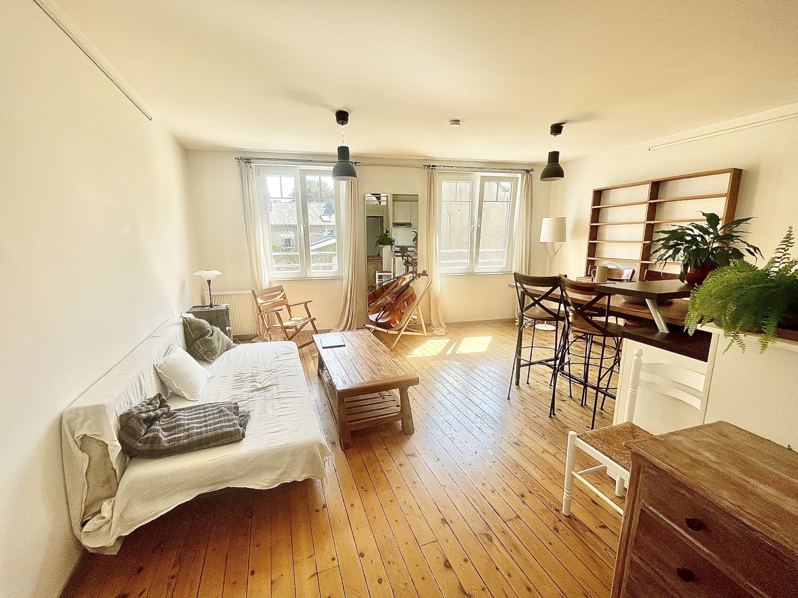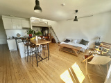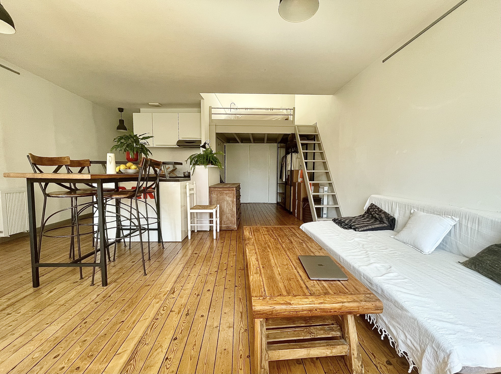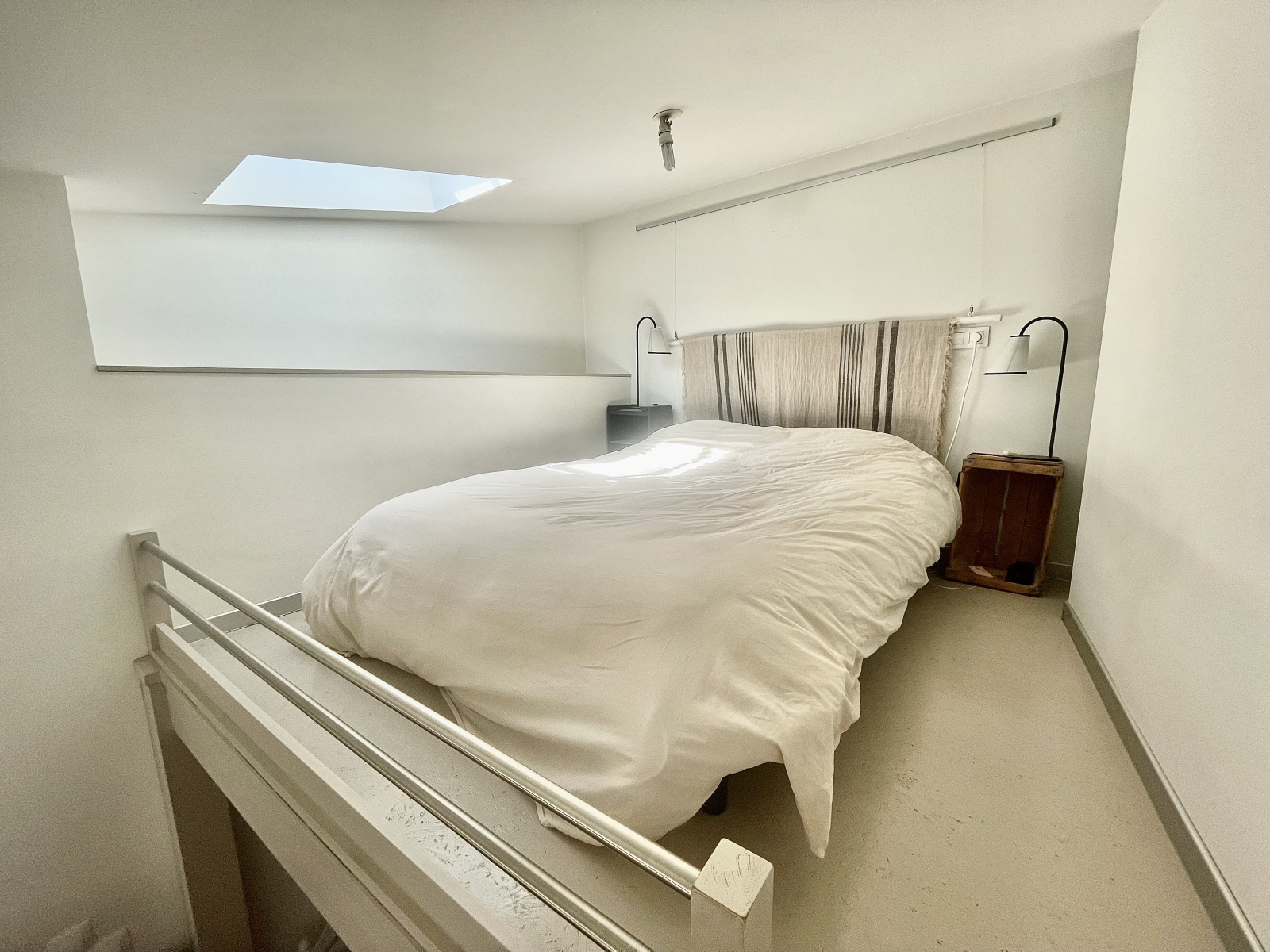 Au 3ème et dernier étage d'un immeuble ancien avec porte sécurisée, appartement rénové avec des équipements de qualité comprenant une entrée, une pièce de vie lumineuse sur parquet ancien avec cuisine ouverte, aménagée et équipée (placards, frigo + freezer, hotte, plaque à induction), un coin nuit en mezzanine avec sommier à lattes (140x190), un coin dressing sous mezzanine avec grand placard et une salle d'eau avec sèche-serviettes,arrivée et évacuation d'eau et WC.