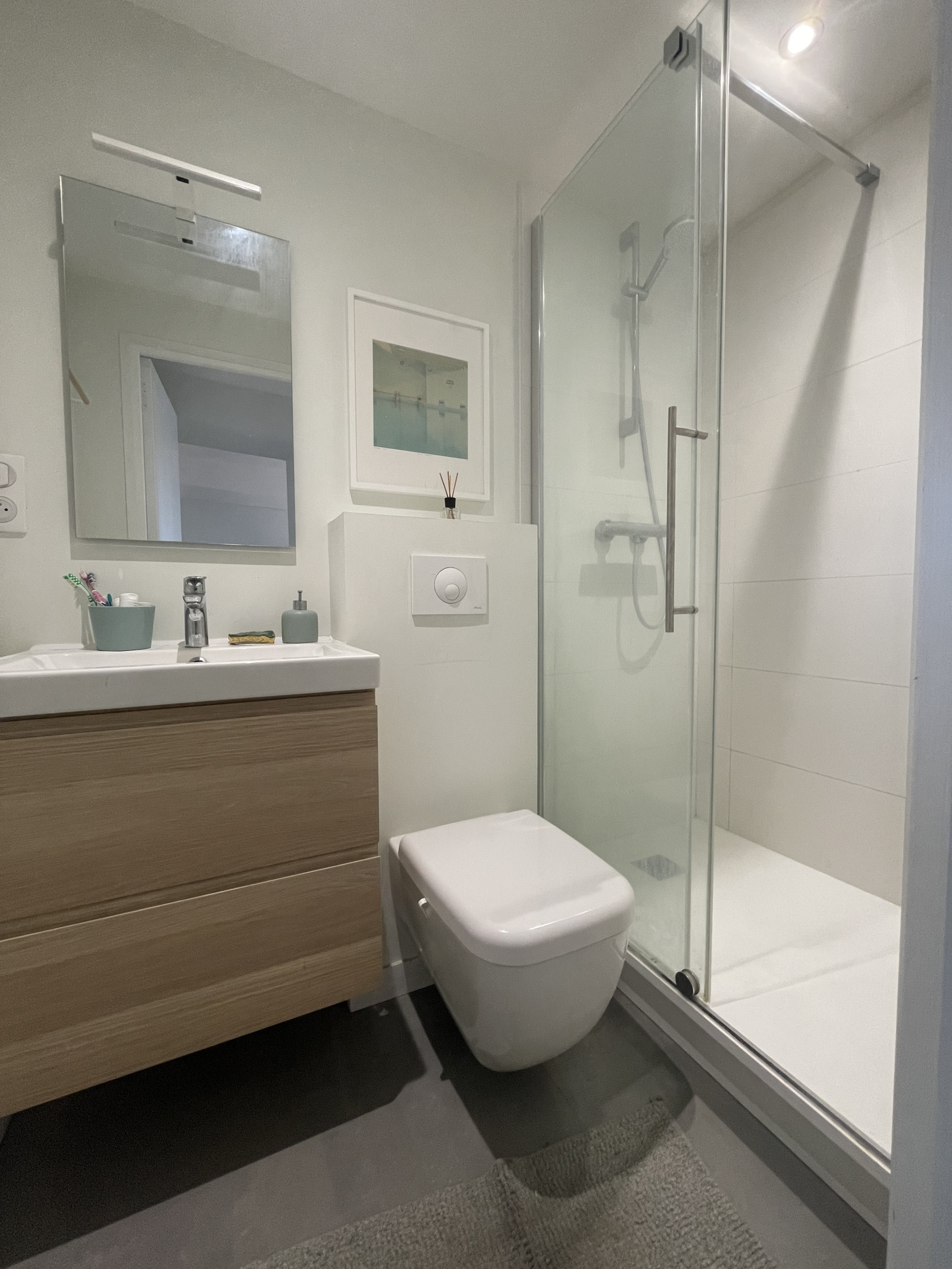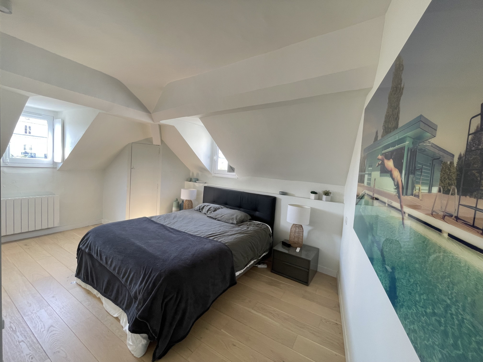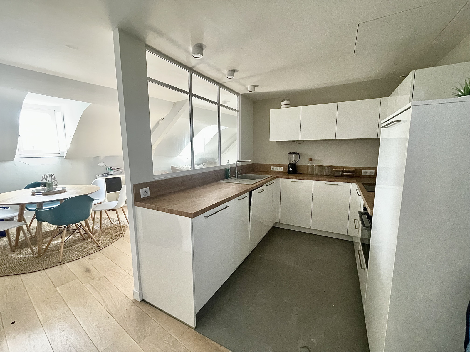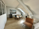 Au quatrième et dernier étage d'un immeuble ancien, charmant appartement type 2 de 48.87 m² entièrement rénové en 2020 avec beaucoup de goût et très bien équipé comprenant une grande pièce de vie avec salon/salle à manger de 22m² et cuisine avec verrière aménagée et équipée (hotte, four, plaque, lave-vaisselle, lave-linge), une belle chambre de 13.27 avec dressing et coin bureau et salle d’eau avec douche, WC et sèches serviettes.