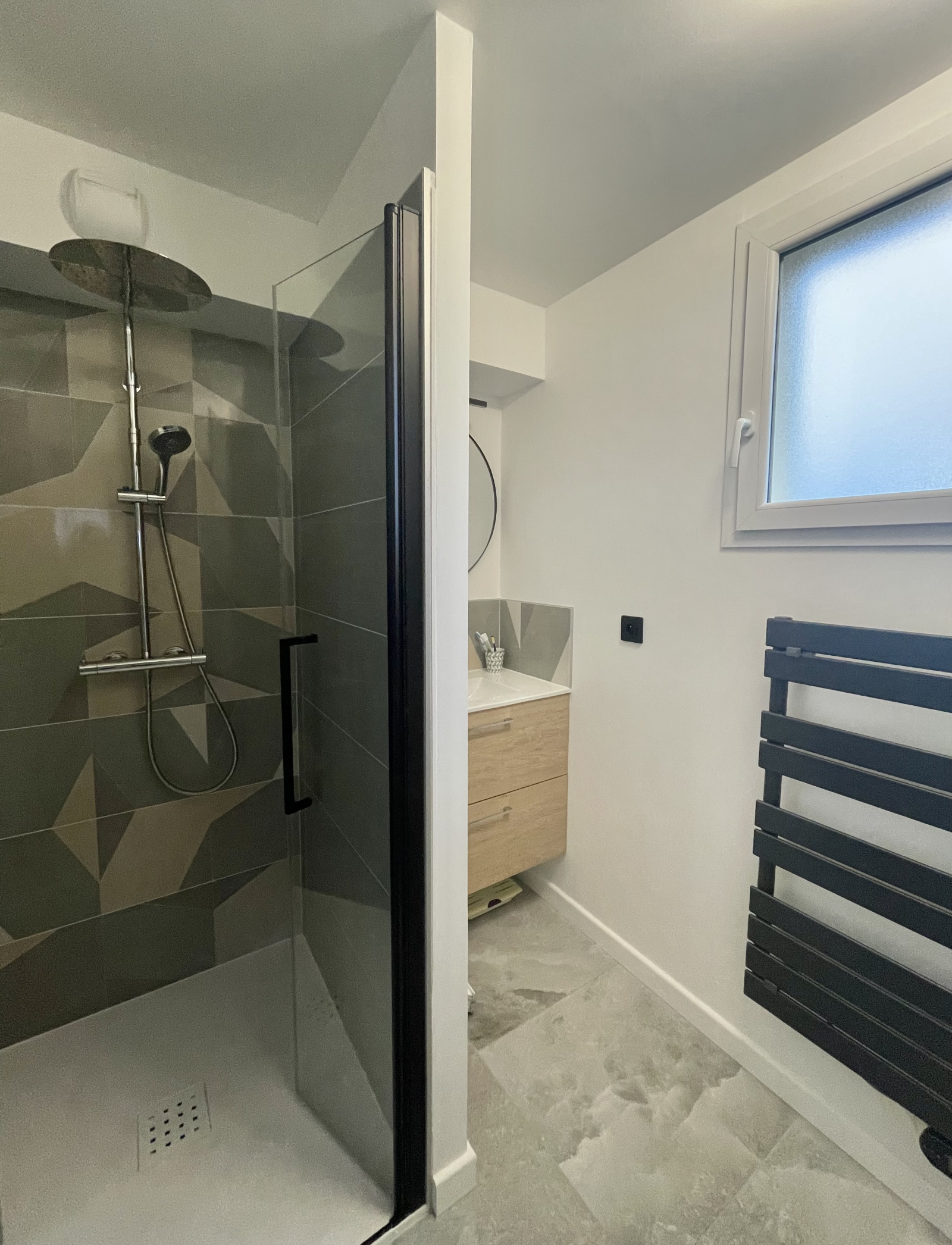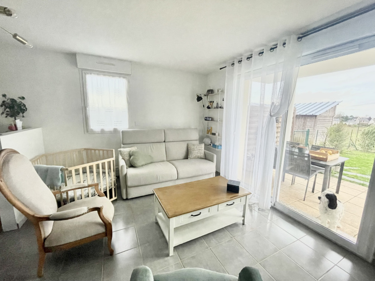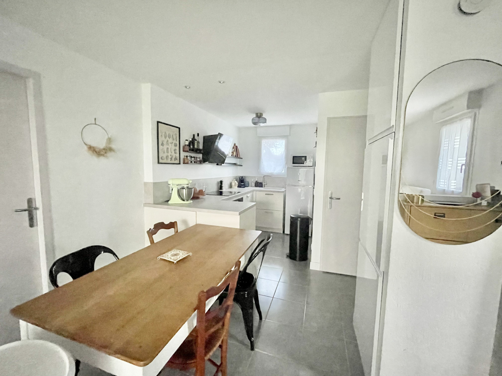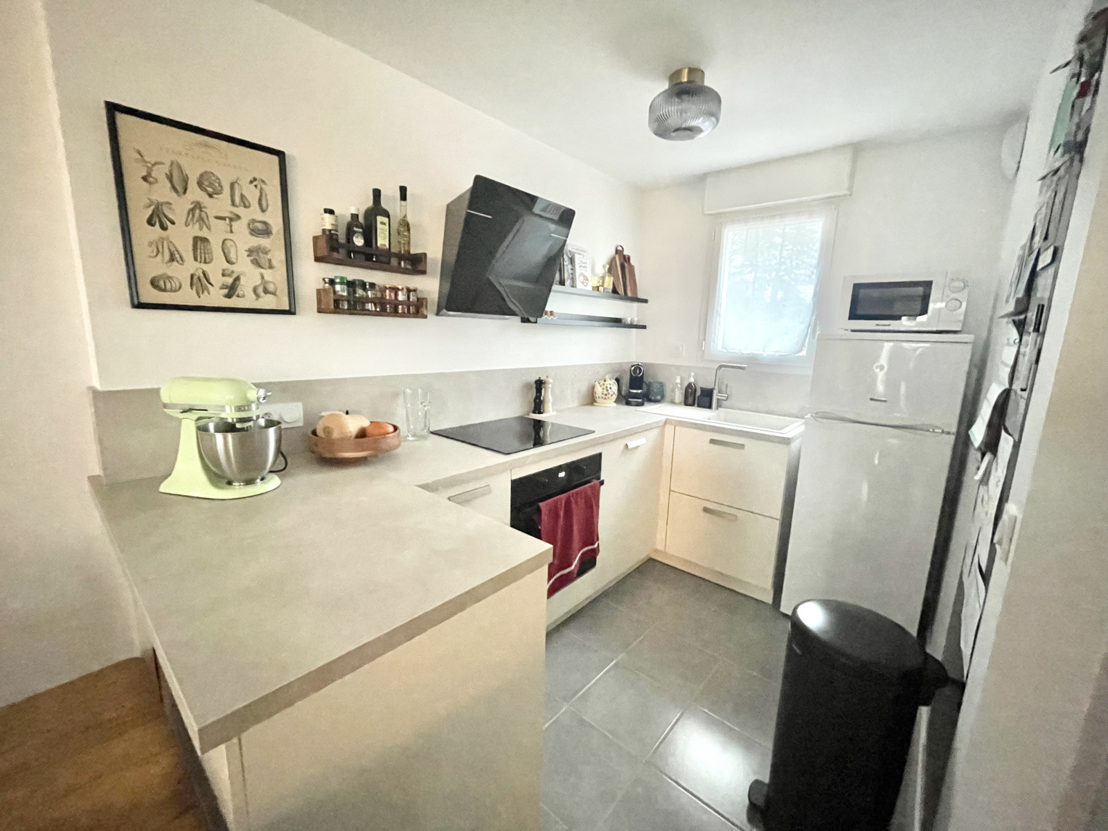 Dans une petite copropriété, bel appartement de type 2 en rez-de-jardin de 43.20m² comprenant : une entrée avec placard, une belle pièce de vie lumineuse avec cuisine ouverte aménagée et équipée ( hotte, plaque de cuisson et lave-vaisselle), une chambre avec dressing, une salle d'eau avec WC et un cellier/buanderie.