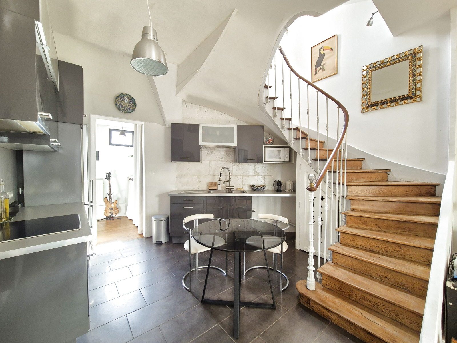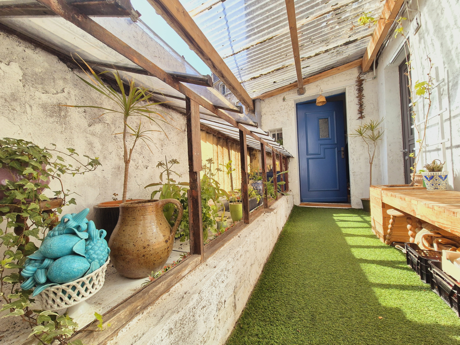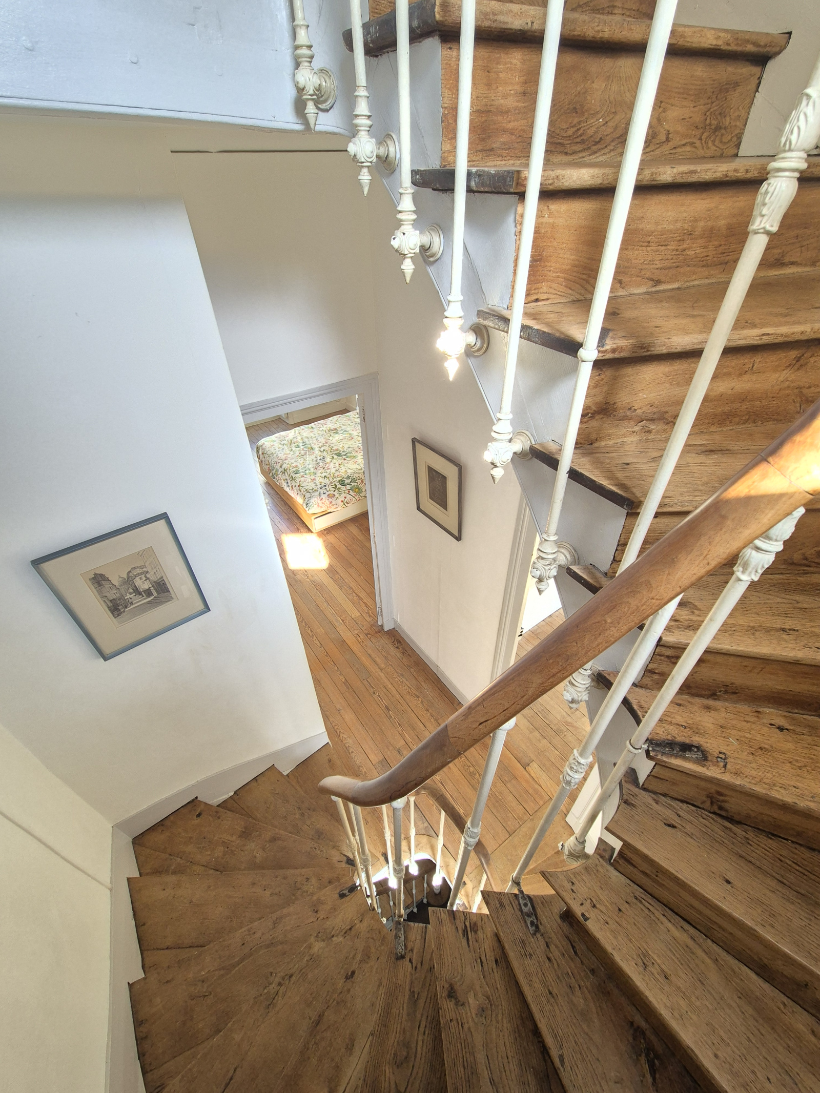 L'accès à l'appartement s'effectue par un jolie jardin d'hiver commun entre deux lots et dessert une entrée avec placard et espace buanderie, une pièce de vie avec cheminée et parquet en bâton rompu, un bureau/chambre en mezzanine et des WC indépendants.