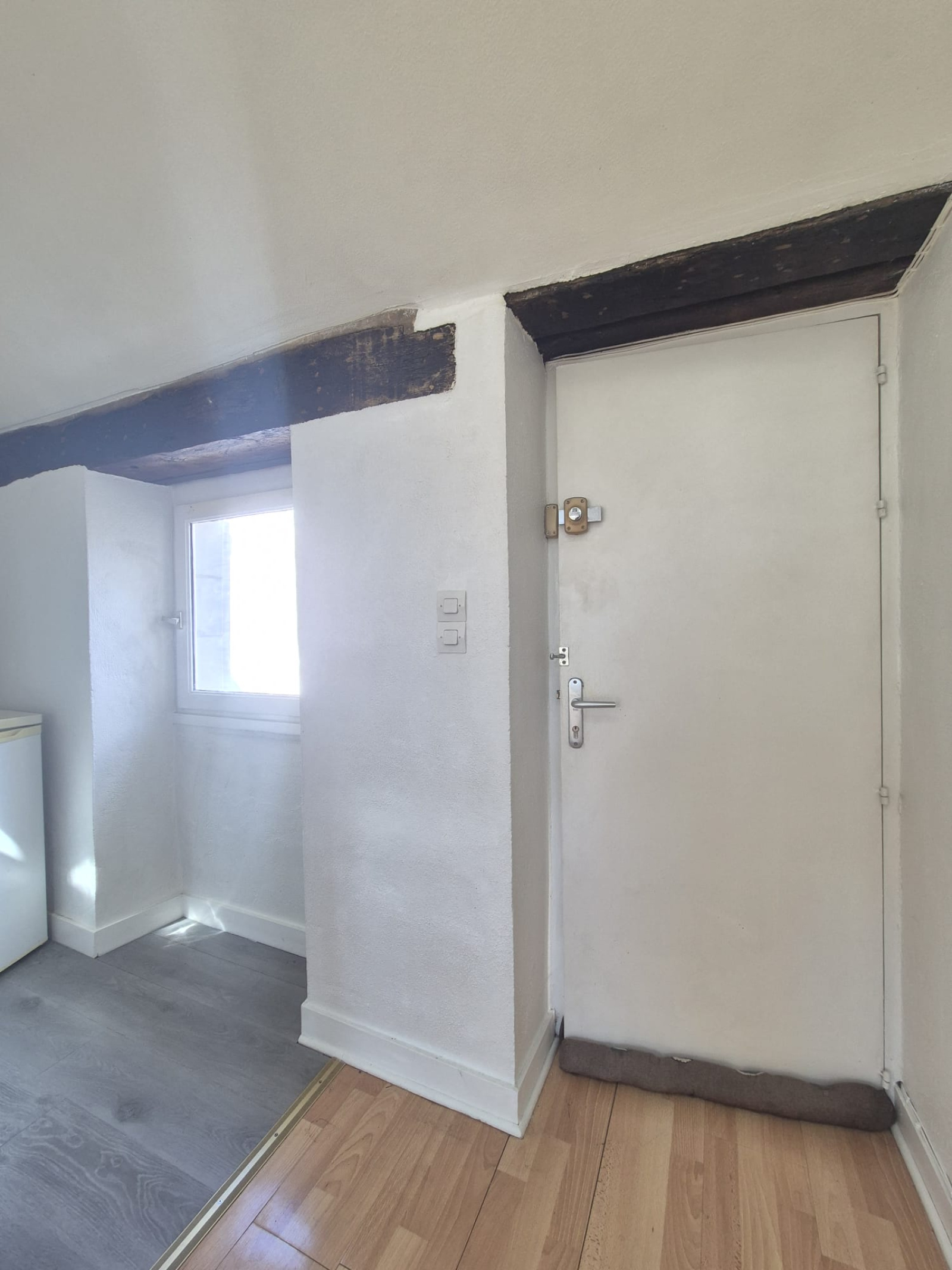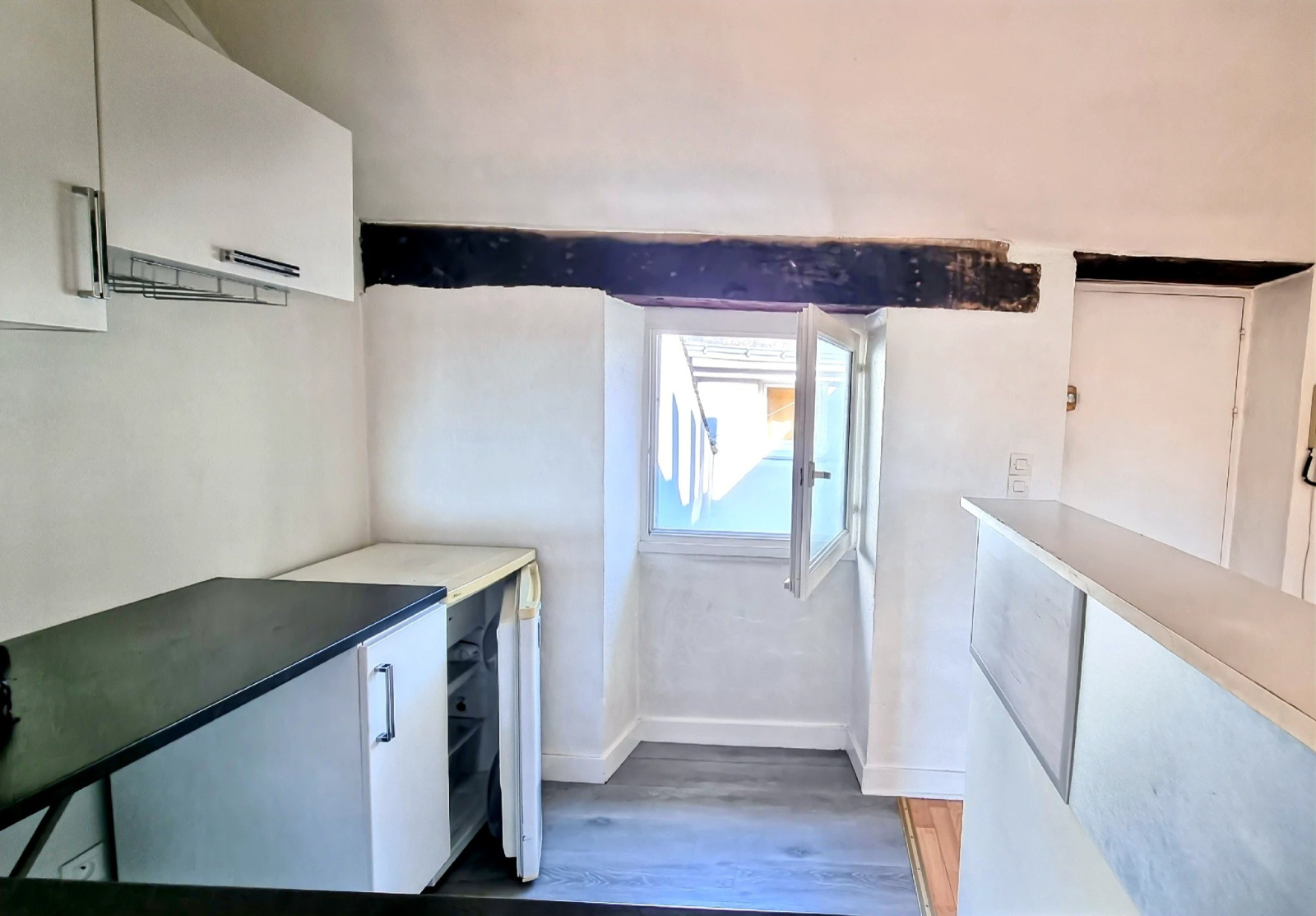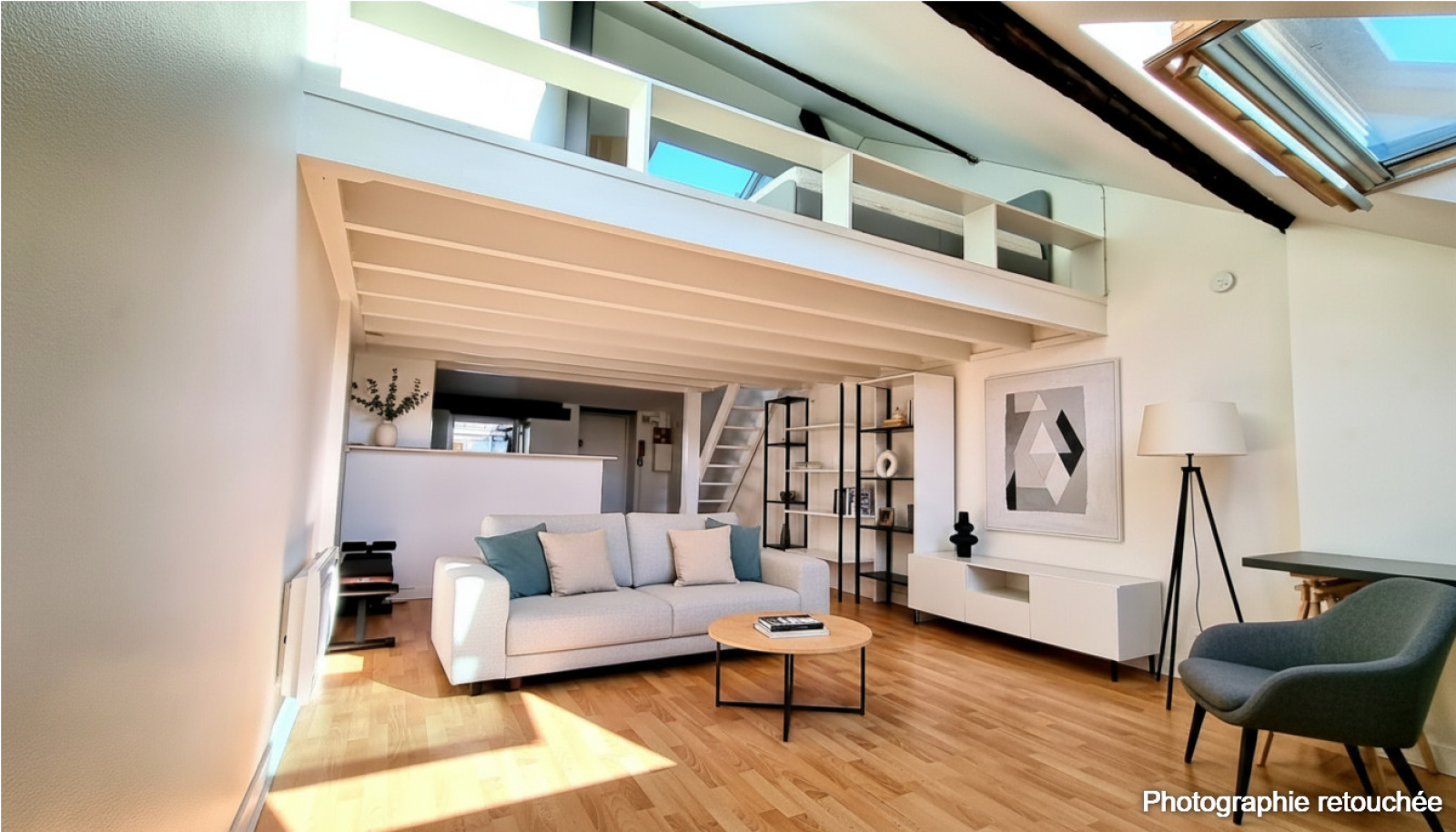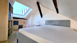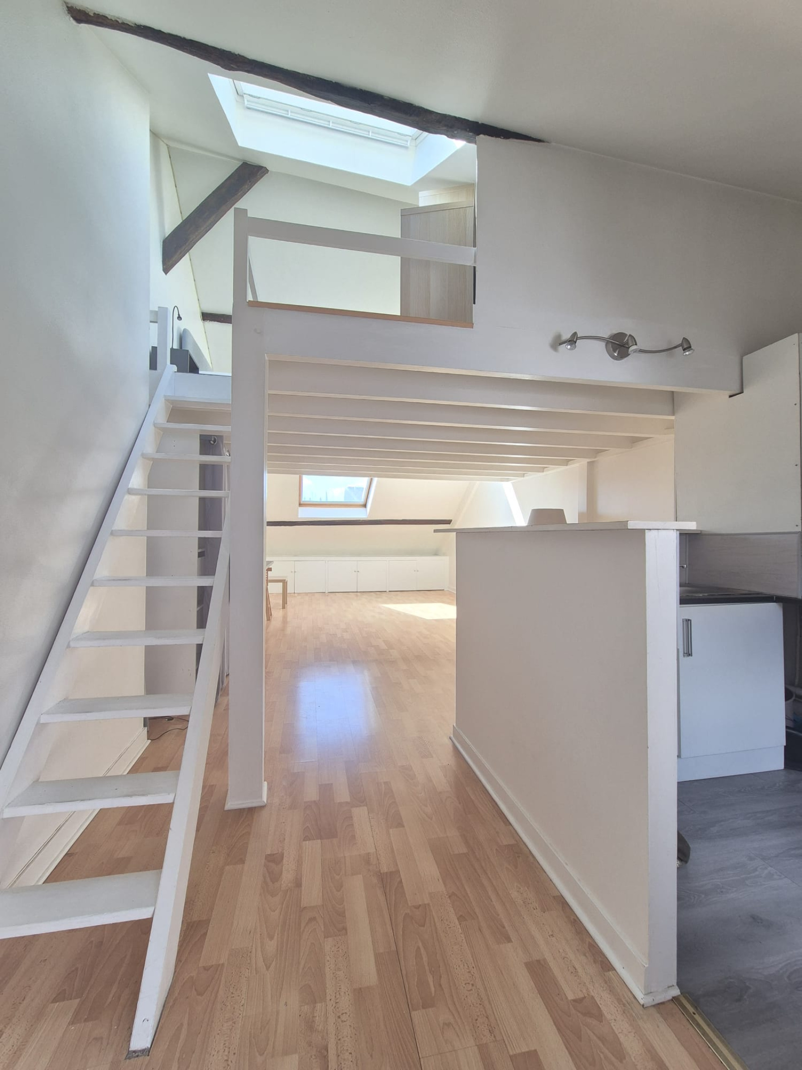 L’appartement s’ouvre sur une belle pièce de vie très lumineuse, bénéficiant de trois grands vélux ainsi que d’une fenêtre côté cuisine, offrant une lumière naturelle abondante et mettant en valeur de beaux volumes.