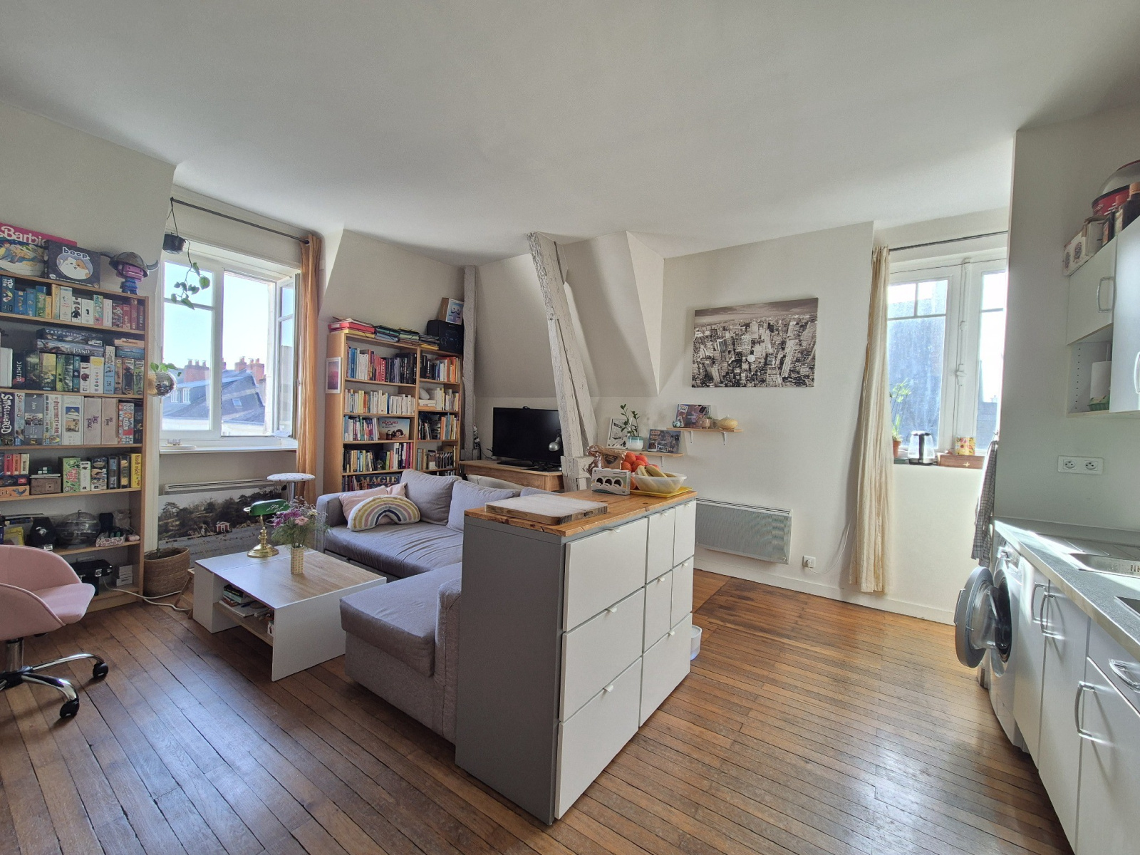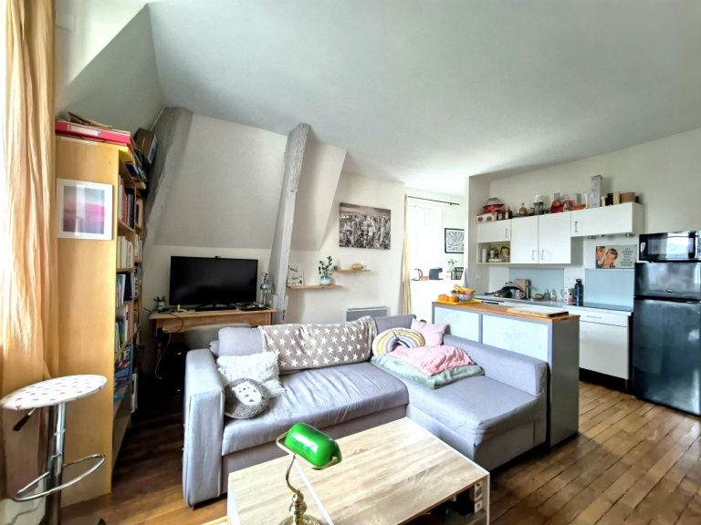 Au dernier étage d'un ancien hôtel particulier, charmant appartement T3 en duplex de 61.30m² au sol et 56.62m² Loi Carrez comprenant au rez-de-chaussée une entrée avec grand placard, une belle pièce de vie exposée Sud/Ouest sur parquet de 26m² avec placard et cuisine ouverte aménagée et équipée, une chambre avec placard et des WC suspendus séparés.