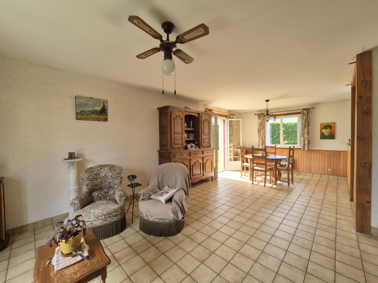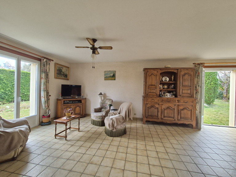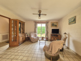 Au calme, maison des années 90 de plain-pied de 86m² comprenant une entrée avec placard, une belle pièce de vie avec triple exposition lumineuse de presque 40m² avec cuisine ouverte, une arrière cuisine, deux chambres de 11m² avec placards et possibilité d'une 3ème chambre, une salle de bain et WC séparés.
