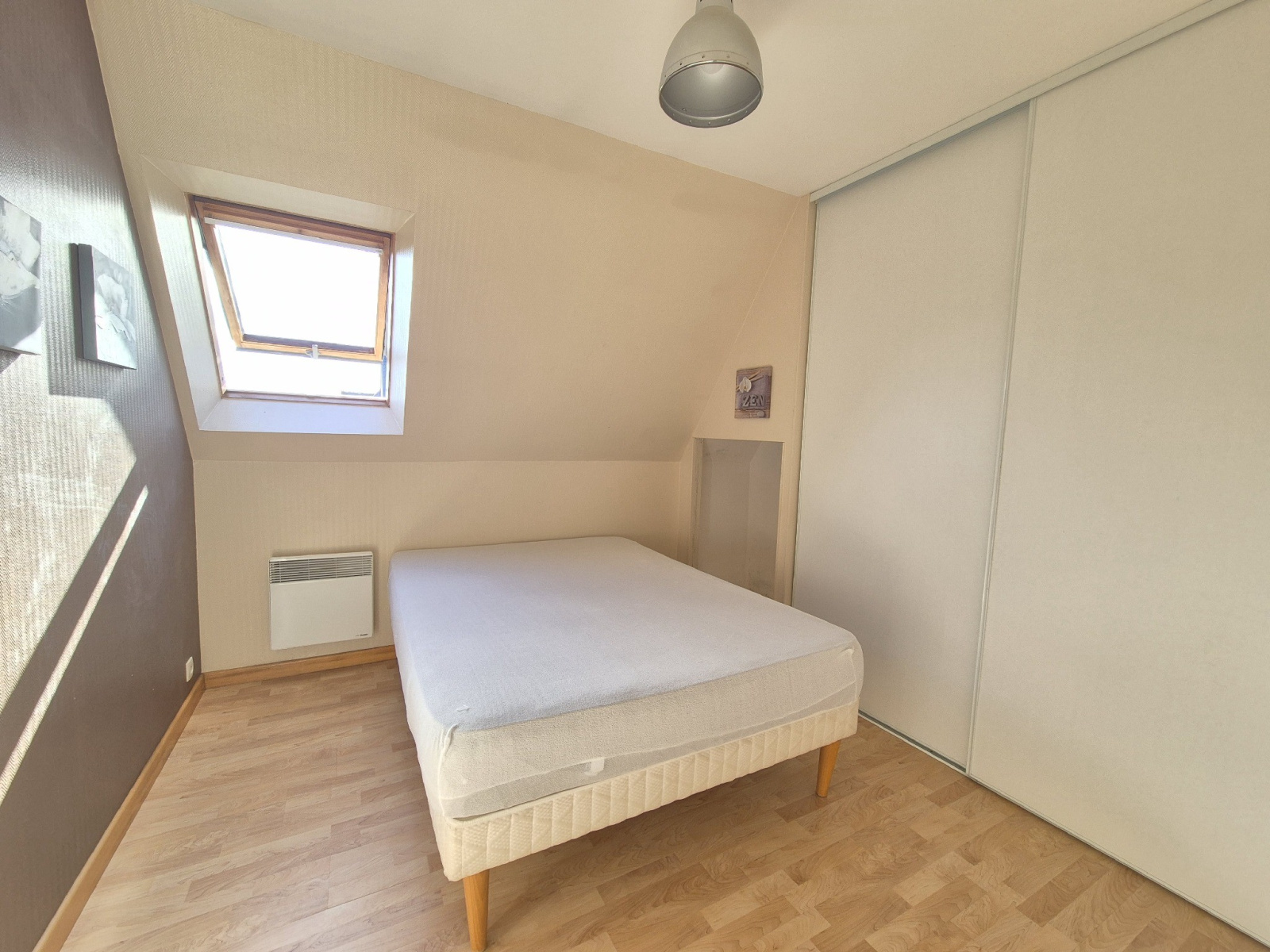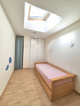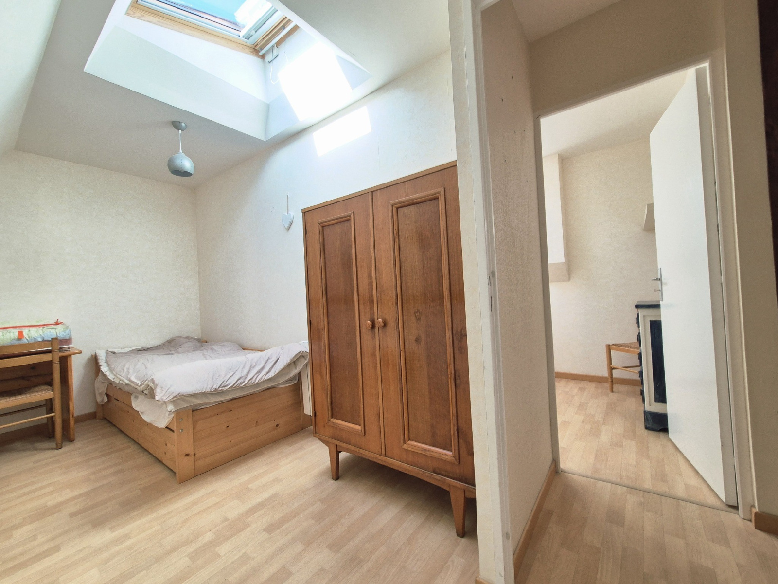 Entrée avec placard, pièce de vie avec cuisine aménagée et équipée donnant sur terrasse, chambre avec placard, salle d'eau et WC indépendants. A l'étage, un palier dessert deux autres chambres.