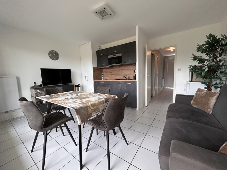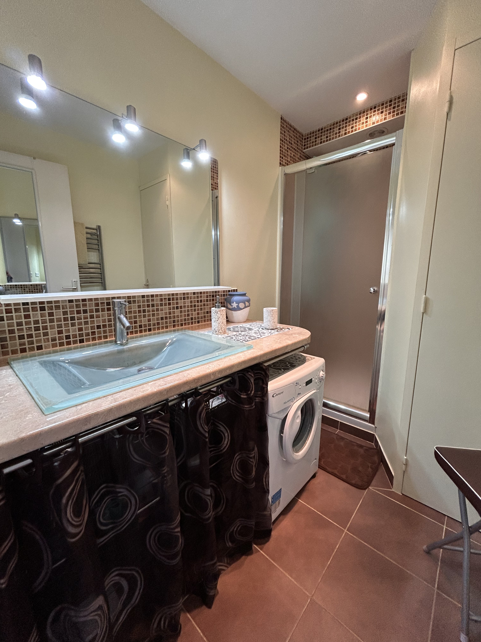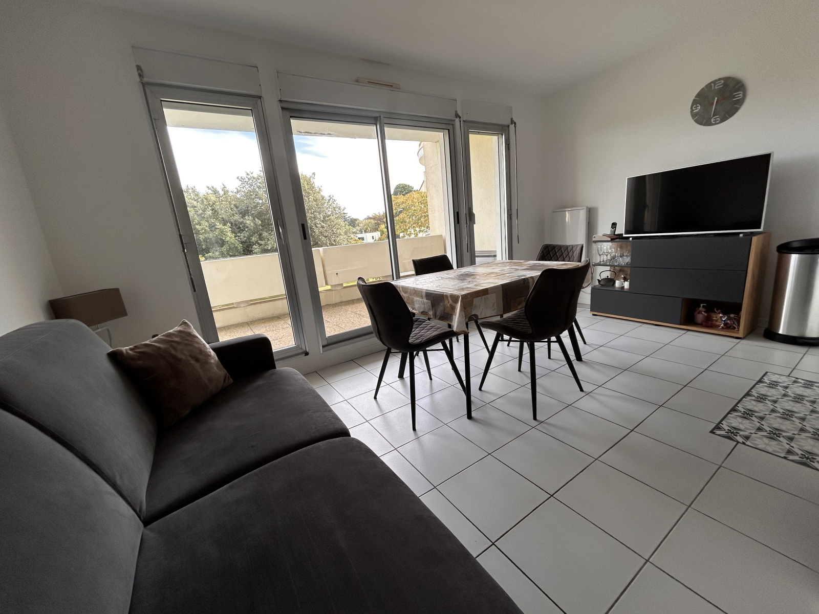 Dans une copropriété calme et sécurisée, cet appartement de Type 2 + cabine permet de profiter du bord de mer et de l'arrière-pays. Il offre une belle entrée avec rangement et coin nuit, une pièce de vie lumineuse avec cuisine aménagée et équipée ouverte donnant sur terrasse de 8m2 exposée plein SUD sur le parc et sans vis à vis, une chambre et Salle d'eau avec wc.