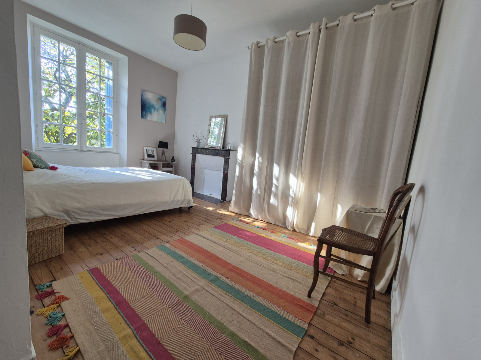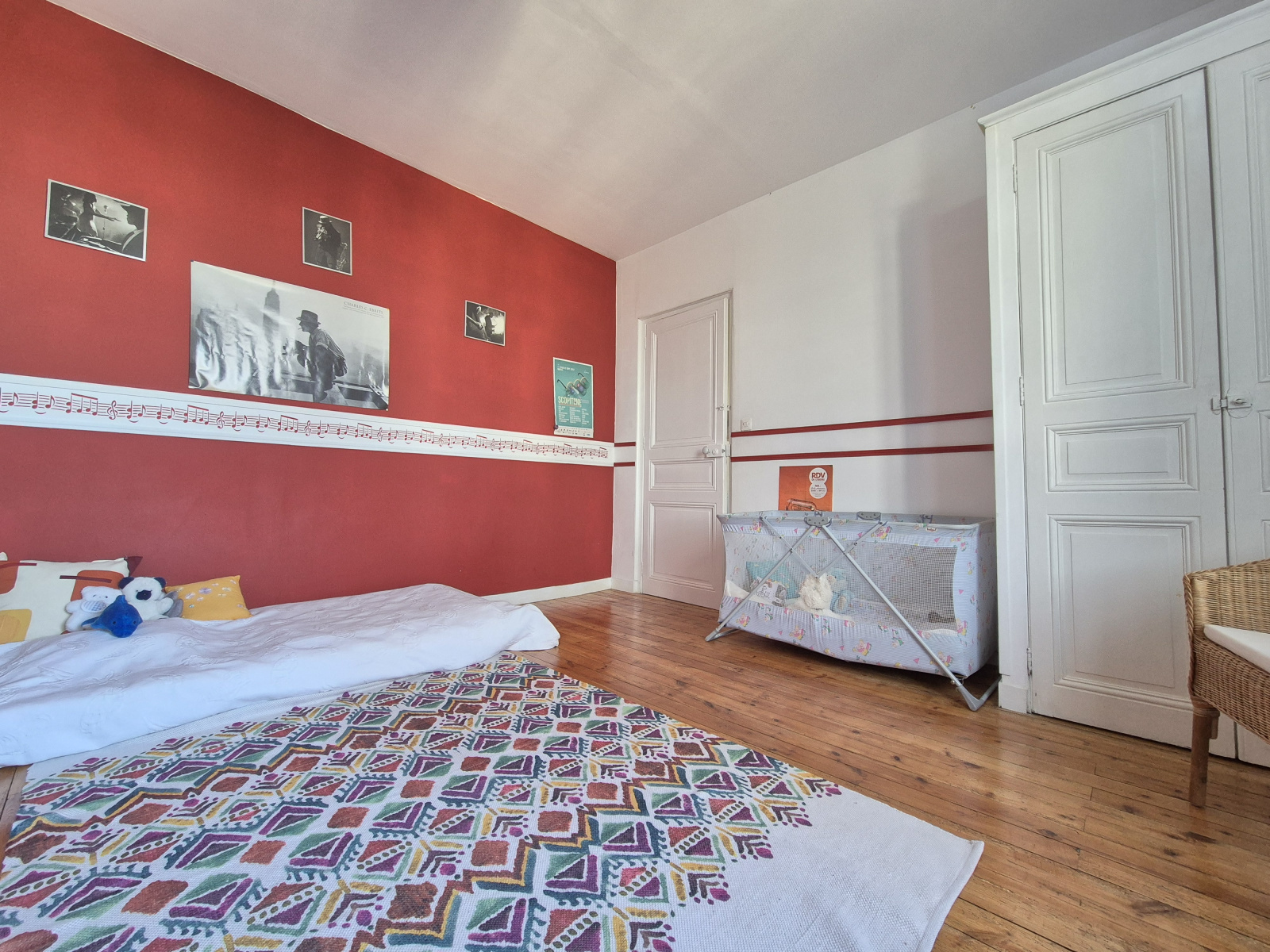 Au premier étage, un palier distribue quatre chambres spacieuses, toutes sur parquet ancien, ainsi qu’une salle de bains lumineuse avec fenêtre et baignoire en fonte.