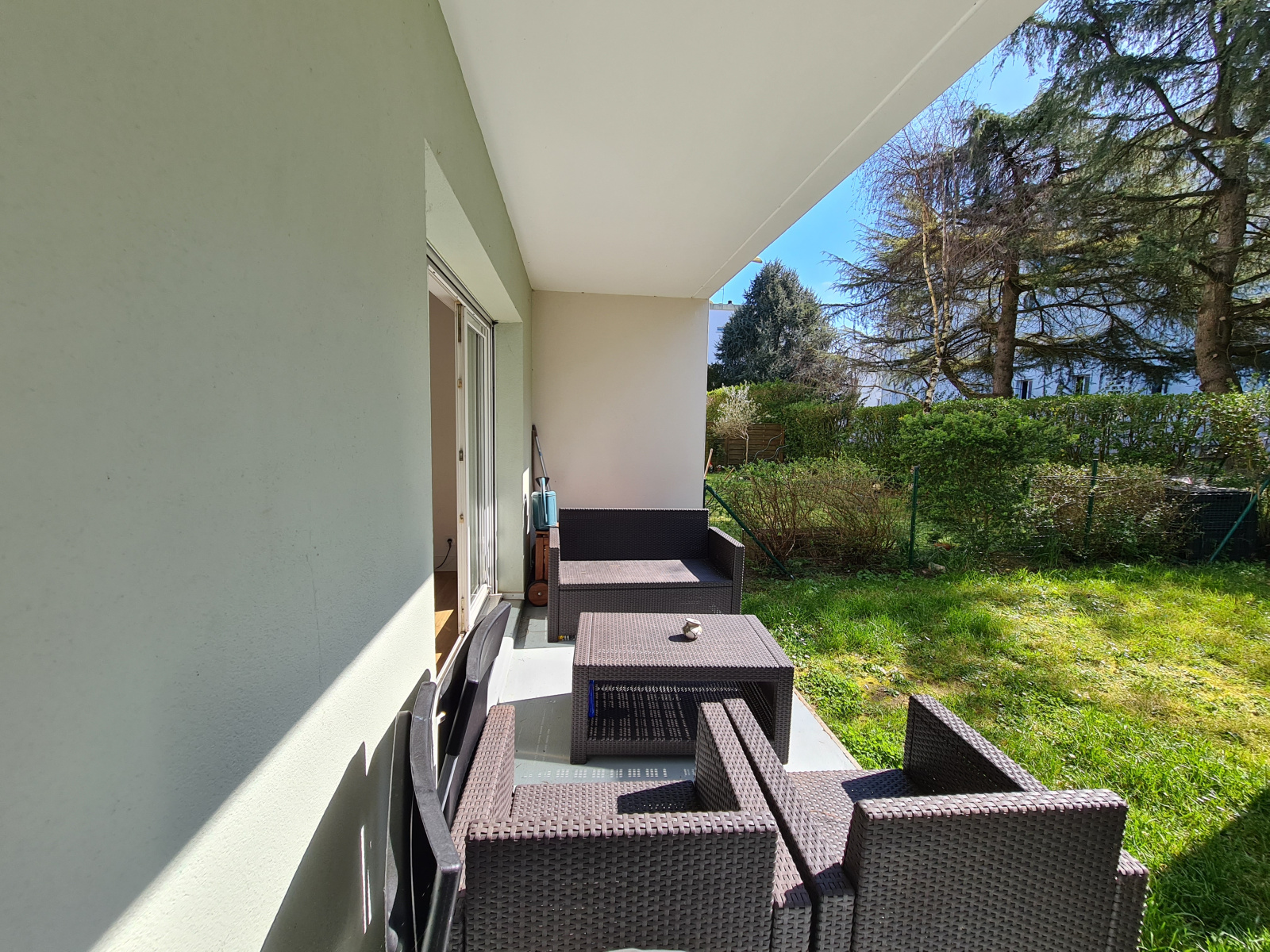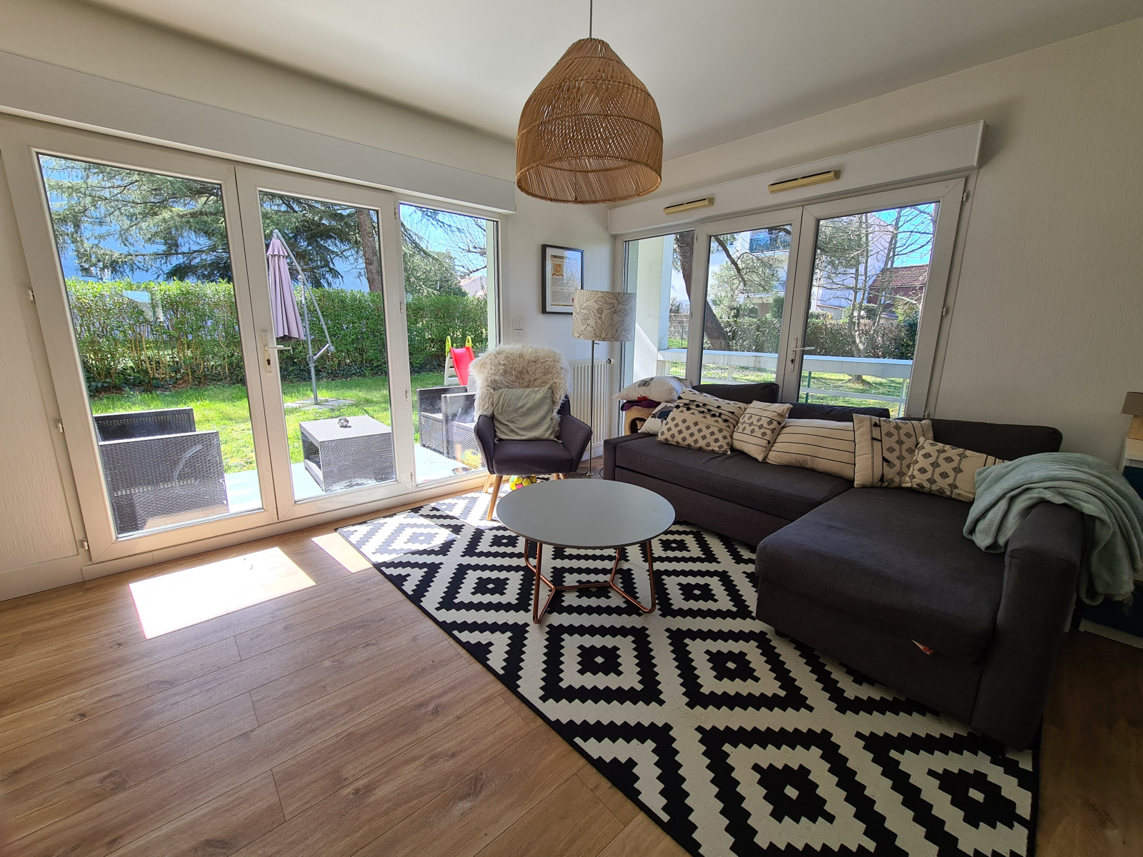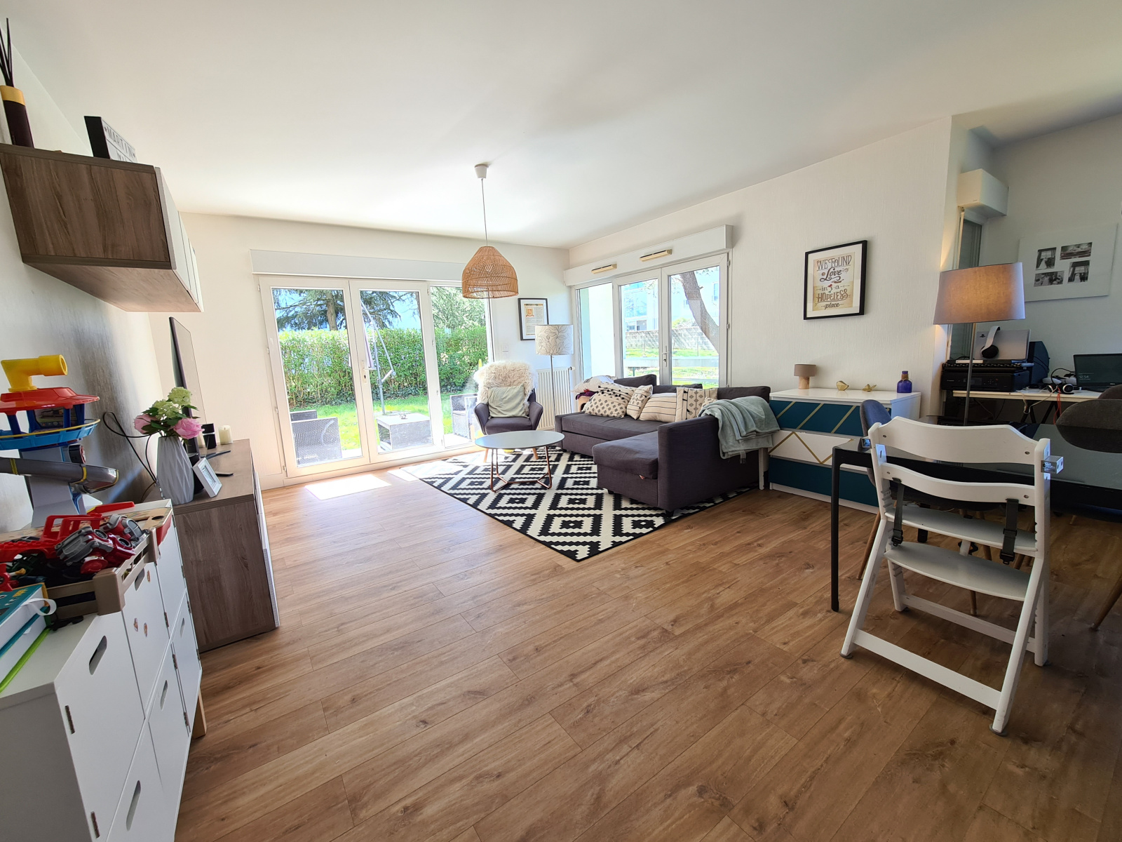 Rare à la vente, Rez-de-jardin proche du tram 8 Mai, au calme comprenant une entrée avec placard, belle pièce de vie lumineuse exposée SUD-OUEST avec cuisine A/E ouverte et donnant sur terrasse et jardin clos de 80m2, 2 chambres avec placards, salle d'eau rénovée avec douche, double vasque et sèche serviette, WC séparés.